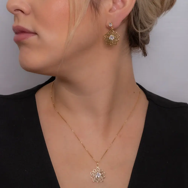 Conjunto Coração em Pedras Cristal - Ouro